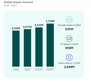 La cantidad de jugadores a nivel mundial alcanzará los 3420 millones en 2024, un aumento interanual del 4,5%. El crecimiento de los jugadores de PC impulsará este aumento sustancialmente. En ese sentido los ingresos monetarios por PC, que aumentaron un 4% interanual hasta los $43.200 millones, superarán los ingresos de los móviles y las consolas este año.