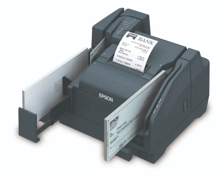 ● Escáneres de cheques: Gran optimización de la gestión de documentos, ideales para bancos y otras instituciones que necesitan soluciones eficientes, precisas, versátiles y seguras para la digitalización de cheques. La Epson TM-S9000 es un nuevo estándar en impresión ya que ofrece inyección de tinta multifunción que endosa y escanea cheques con calidad y confianza en un solo paso. La Epson TM-S2000 es un dispositivo multifunción versátil de alta velocidad con escaneo dúplex, diseñado para procesar grandes volúmenes de manera rápida y eficiente, además de una notable flexibilidad de configuración, ideal para la mayoría de las instituciones financieras. El escáner de cheques Epson TM-S1000 ofrece calidad y confianza en un diseño compacto y fácil de usar. Este equipo brinda la flexibilidad necesaria para procesar excepciones, cheques del mismo banco o separar distintos tipos de documentos como cheques y cupones de pago según las necesidades.